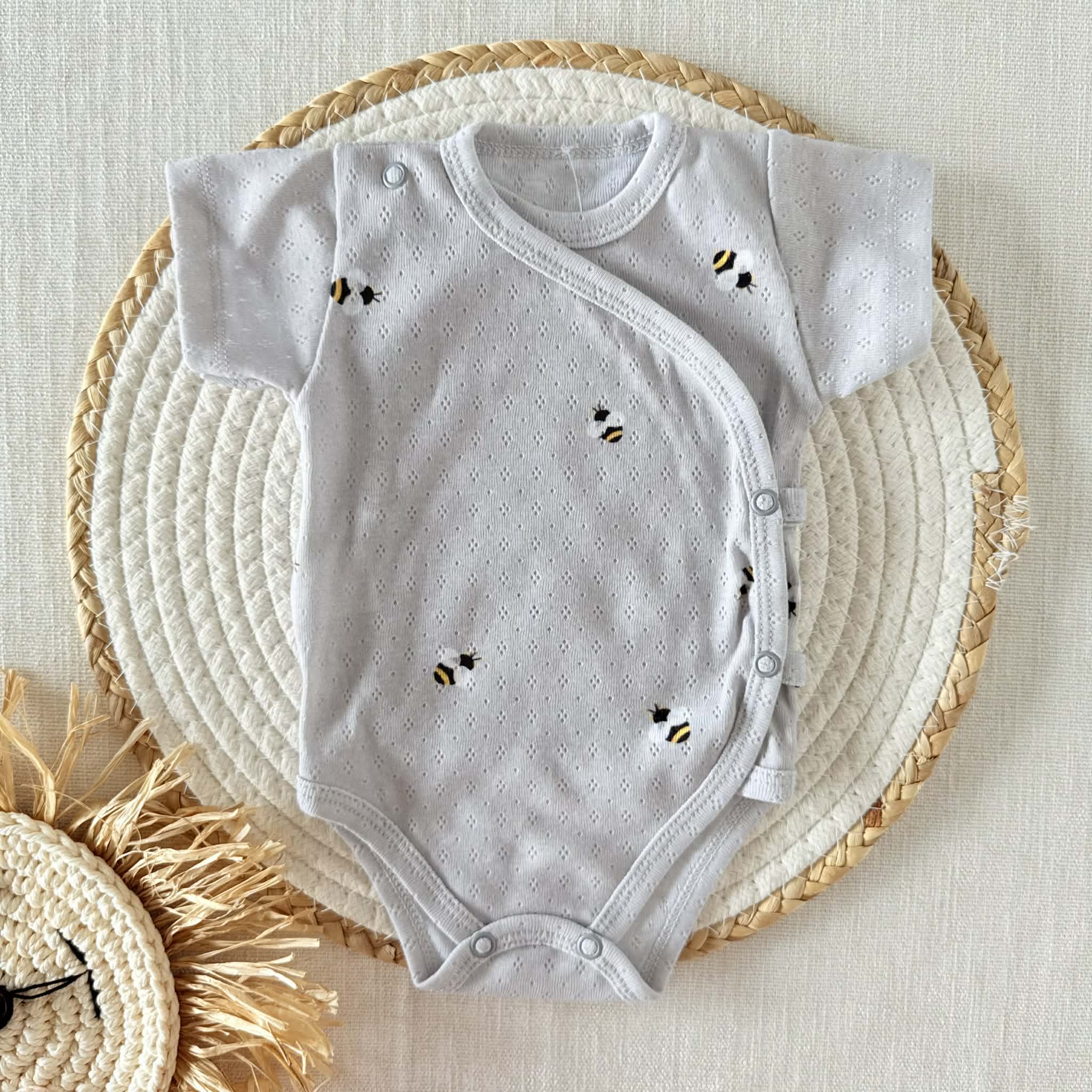 Uszyte w Polsce śliczne i niebanalne bodziaki. Wszystko za sprawą bawełny ażurkowej wyróżniającej się oryginalną teksturą. Bodziaki zdobi trwały, niewyczuwalny w dotyku druk cyfrowy przedstawiający pszczółki. Bodziaki zapinane są na bezpieczne dla dziecka, bezniklowe napki. Bodziaki zapinane są kopertowo.